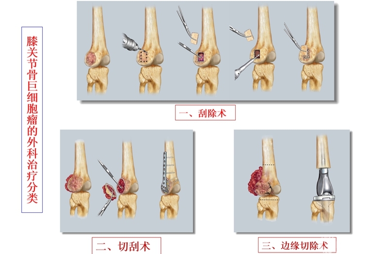 临床上骨巨细胞瘤的外科治疗可根据分类确定手术范围和程度,对于骨强度好一般采取刮除并植骨;骨强度差且连续性完整的,多选用手术刮切结合钢板植入;而出现骨连续性中断的,往往需要切除后行假体植入。