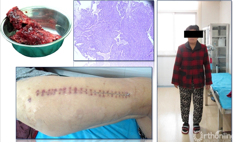 患者女性,68岁,乳腺癌病史,右股骨中段病理性骨折,股骨长段溶骨性破坏,并有跳跃病灶。病变的长度为16cm,病灶近端在小转移水平,因为近端髓腔柄较短,故选择A区骨干假体。经病理诊断为转移性腺癌,术后2周患者拆线后即可离床活动。