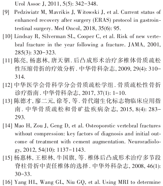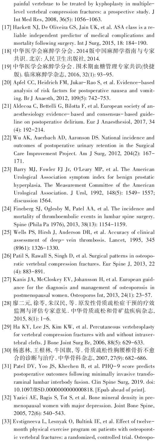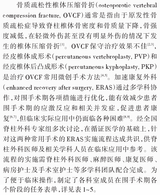 随着人口老龄化,骨质疏松性椎体压缩骨折(OVCF)的治疗日益受到社会重视。经皮椎体成形术(PVP)和经皮椎体后凸成形术(PKP)是治疗OVCF最常用的微创手术。将加速康复理念引人OVCF患者围手术期管理,可以减少手术并发症,提高临床疗效。