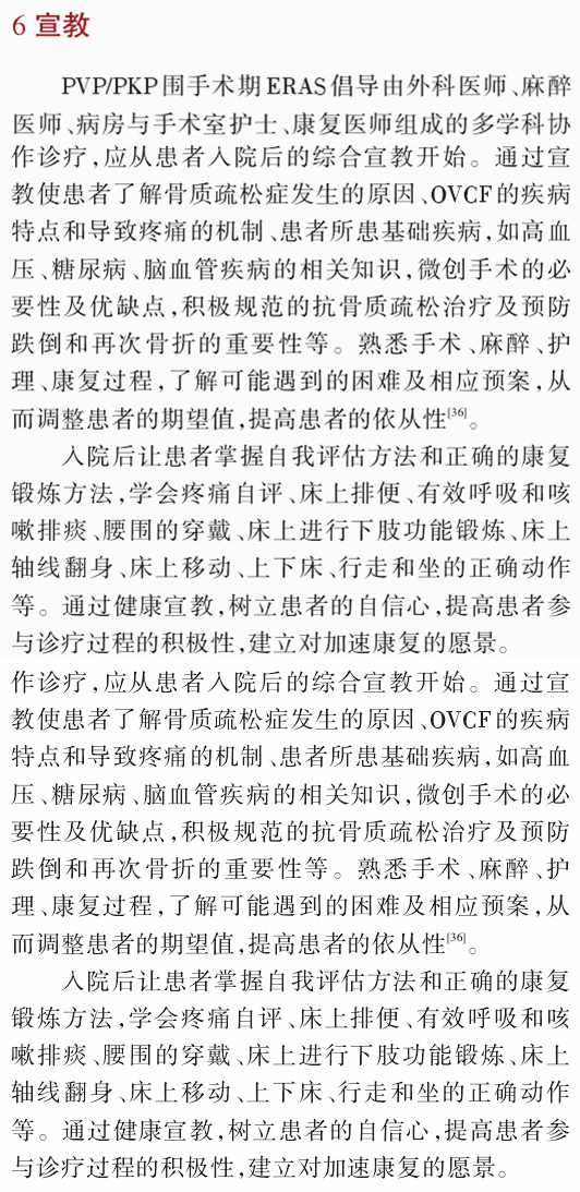 我们在编订的《脊柱外科加速康复-围术期管理策略专家共识》的基础上,结合PVP/PKP手术特点,经全国专家组反复讨论,达成了相关实施流程的专家共识,供脊柱外科医师在临床工作中参考。