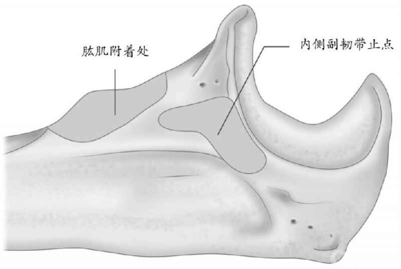 冠状突为肘关节前方关节囊提供附着点,肱肌附着在远端关节囊前面(图2),内侧尺侧副韧带附着在冠状突顶点内侧的结节部(图3和图4),这进一步加强肘关节的稳定性。
