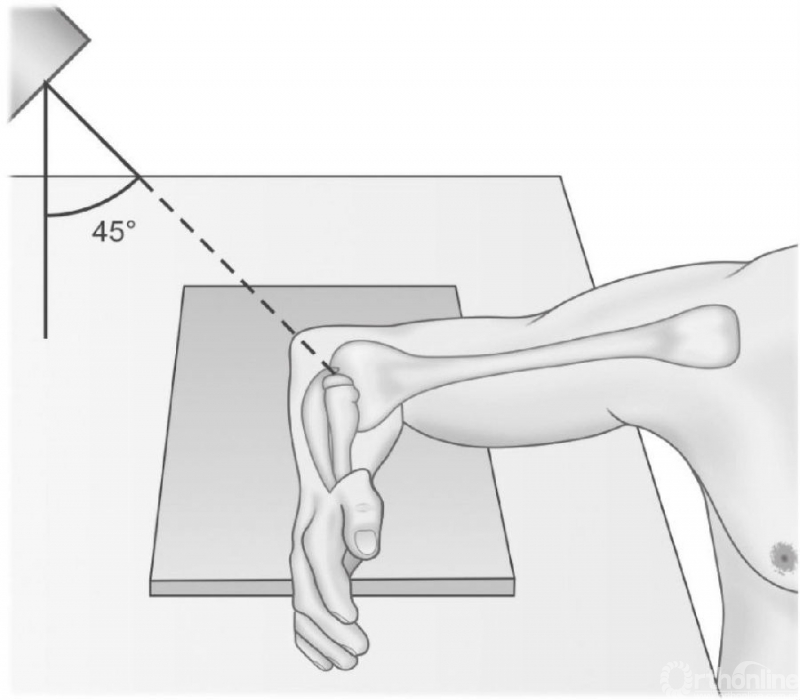 为避免这个情况,Greenspan和Norman介绍了肱桡位片(图6和图7)。这个位置可以把桡骨头及冠突区分开,可以提供清晰的冠突、桡骨头、肱桡关节和上尺桡关节。有时普通的X线片难以提供完全确切的诊断依据,这就需要行CT扫描或MRI检查。