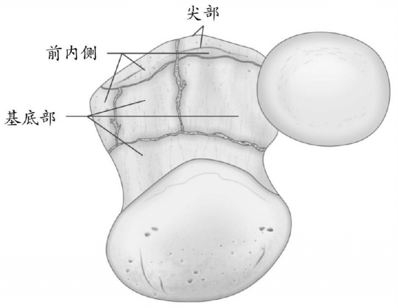 O'Driscoll等人提出了一种新的分型方法,如下:I型为涉及冠突尖部的骨折;II型为骨折线涉及前内侧突起的骨折;III型则为通过冠突基底部的骨折。根据冠状突骨折块的大小,上述三型骨折还可以细分为更多的亚型(图8)。