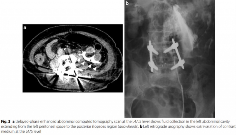 参考文献:Kubota G , Orita S , Umimura T , et al. Insidious intraoperative ureteral injury as a complication in oblique lumbar interbody fusion surgery: a case report[J]. Bmc Research Notes, 2017, 10(1):193.