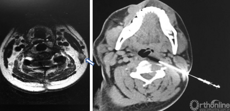 病人在康复科做呼吸功能康复的时候,偶然摸到脖子的侧方皮下有个包块。给病人做的颈部核磁显示在左侧胸锁乳突肌后缘有一个小球形的肿瘤。对照术前经皮穿刺的CT,我们判定这个肿瘤是穿刺造成的针道种植。