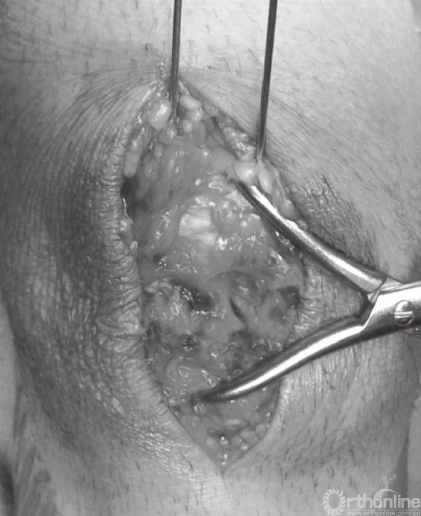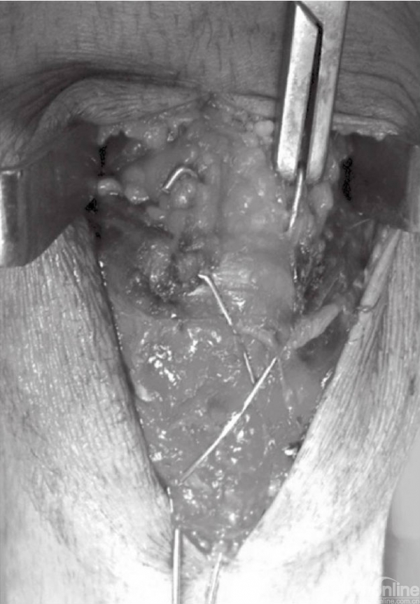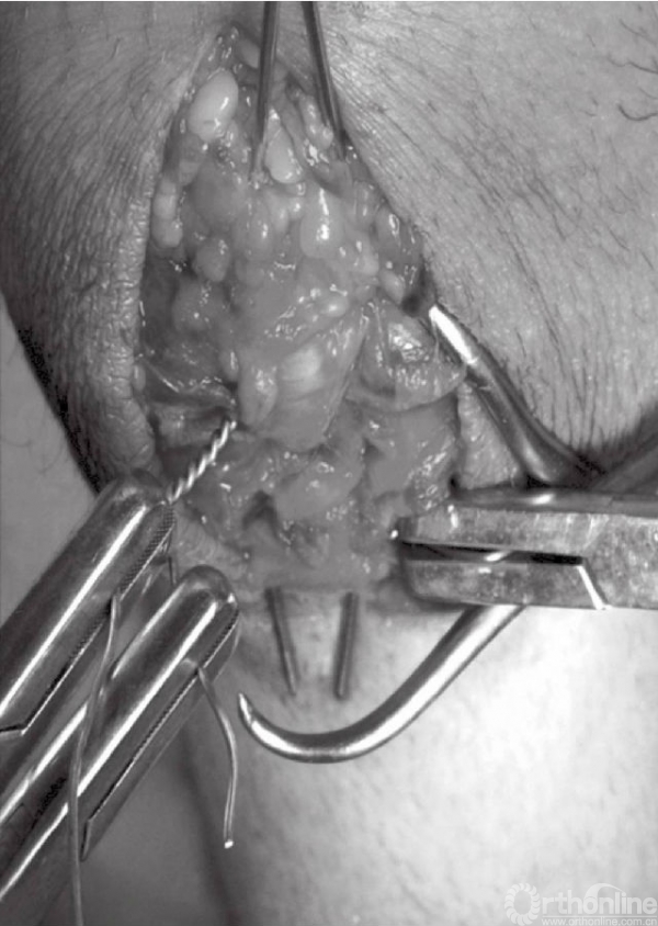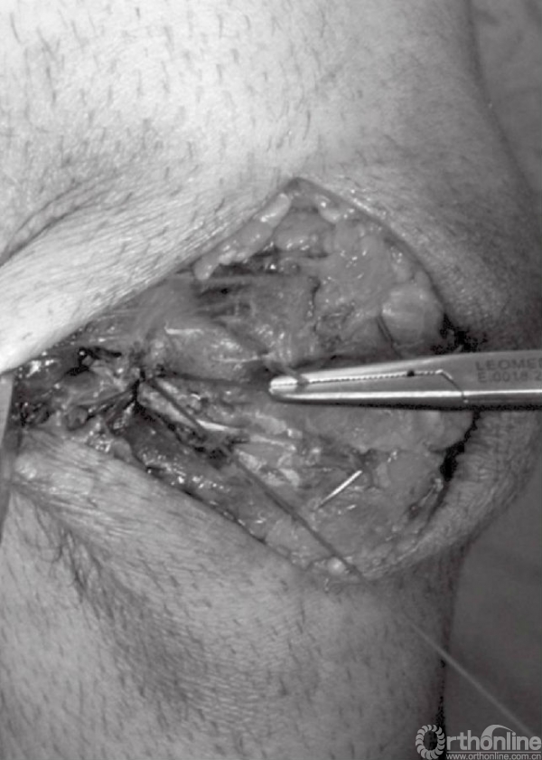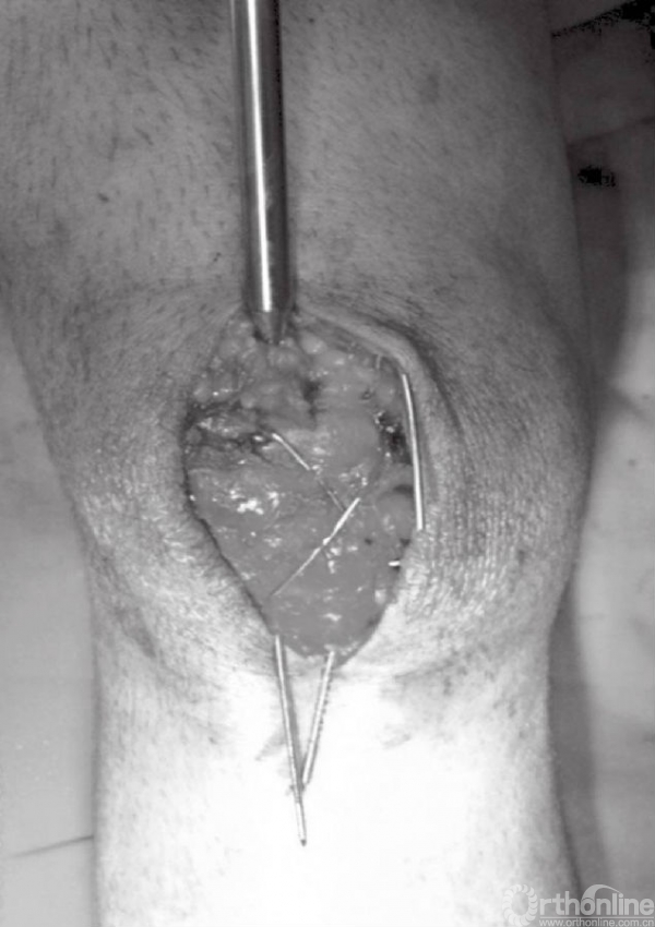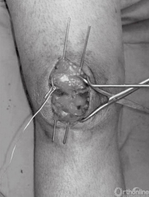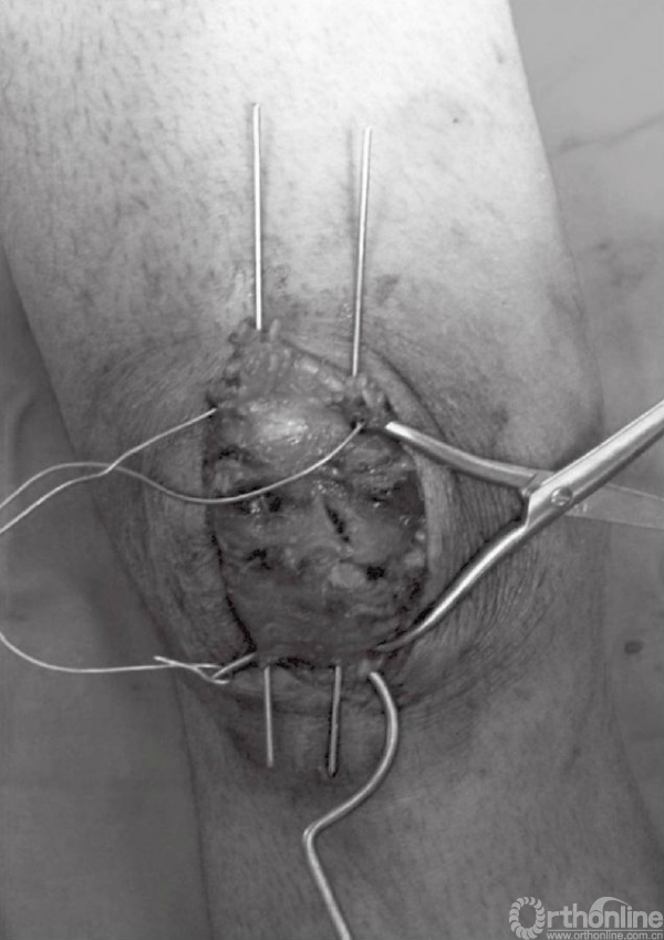 图18 在髌骨两侧用不可吸收缝线缝合撕裂的支持带