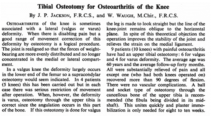 胫骨高位截骨术(High tibia osteotomy,HTO)1958年首先由Jacksn报道;直到1965年Covertry开始倡导并推广,认为HTO可以缓解关节疼痛,并将此术式称之为安全有效的治疗措施。