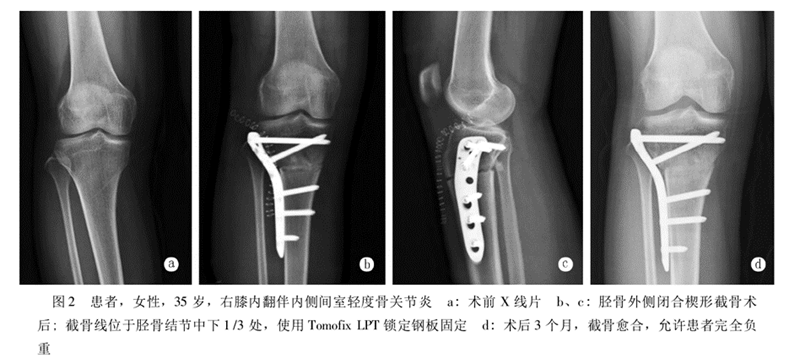Covertry等采用胫骨外侧闭合截骨术治疗24例共30膝关节骨关节患者,其中12例共18膝术后取得满意的临床疗效,认为此术式可以明显缓解关节疼痛,延缓关节炎进展,建议推广使用治疗膝关节骨关节炎患者。