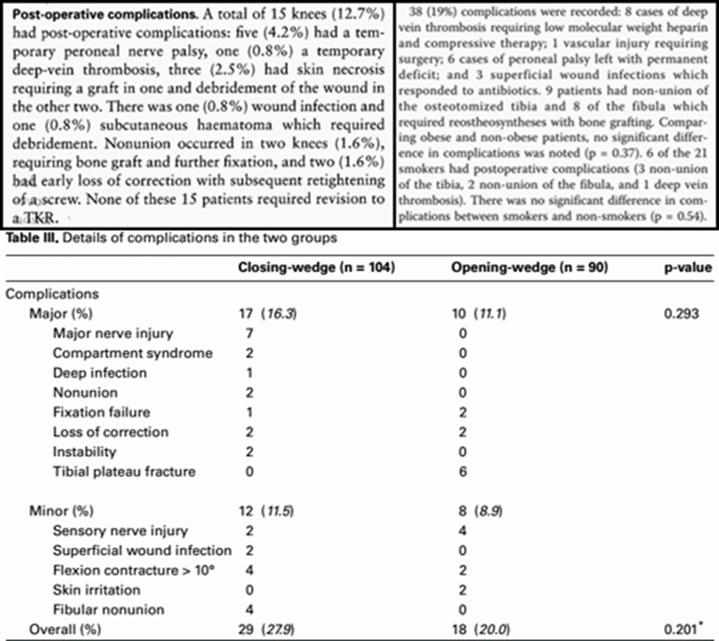 Odenbring等采用HTO治疗314例,随访时间为10-19年,其中144例力线矫正满意,170例力线矫正不足。前者只有8例接受了翻修,后者有54例接受了翻修。Odenbring认为,如果准确地实行HTO,其生存时间可与TKA的生存时间相媲美。