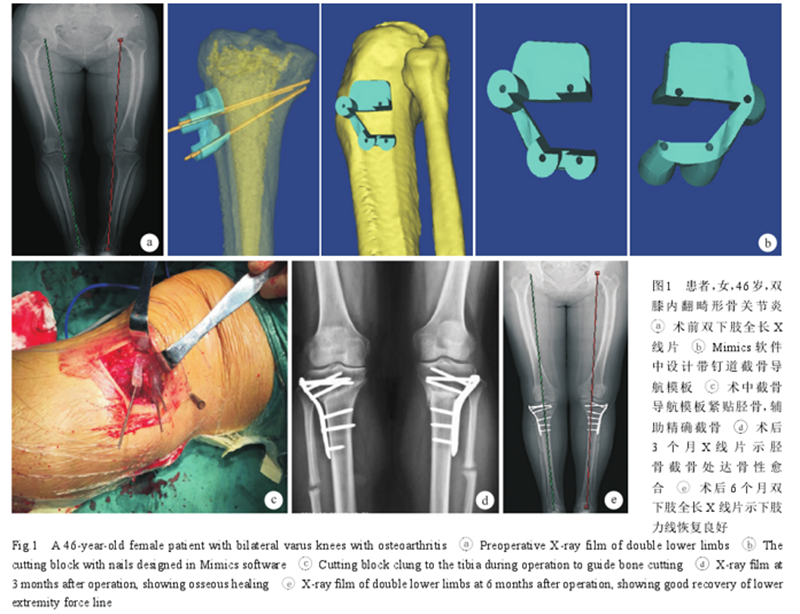 陈国仙等利用3D打印技术辅助CWTHO术治疗膝内翻畸形骨关节炎患者20例,术前于Mimics软件设计并3D打印截骨导航模板,术中在模板辅助下行闭合楔形截骨。16例获随访,优良率达95%,1例出现腓总神经麻痹症状。3D打印截骨导航模板可精确辅助术中截骨,避免反复多次透视以及截骨,可获得良好临床疗效.