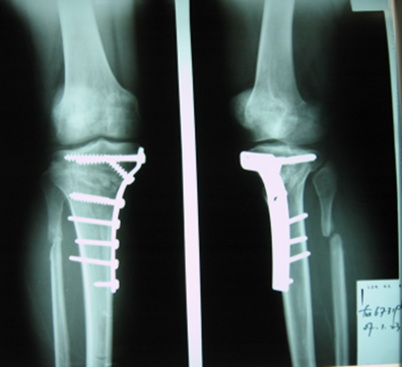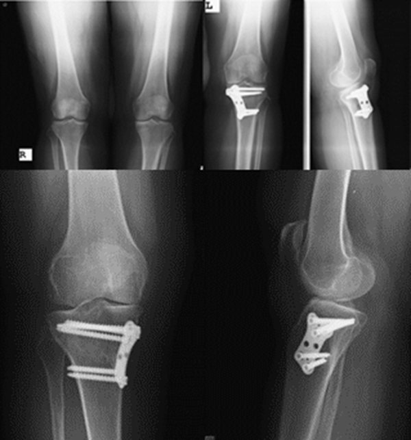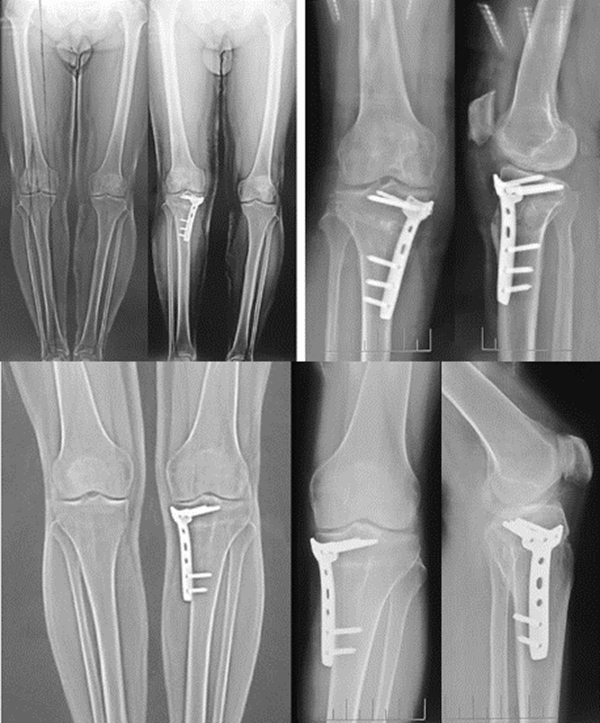 选择不同的内固定,临床结果不尽相同。一组使用门型钉作为内固定的HTO病例,7.5年随访的满意度仅有60%;使用角钢版作为内固定的HTO病例,8.4年的随访满意度为61.1%;使用非锁定型Puddu钢板作为内固定的HTO病例,其并发症发生率高达43%;使用Tomofix锁定钢板作为内固定的病例,6.5年满意度高达98.5%。