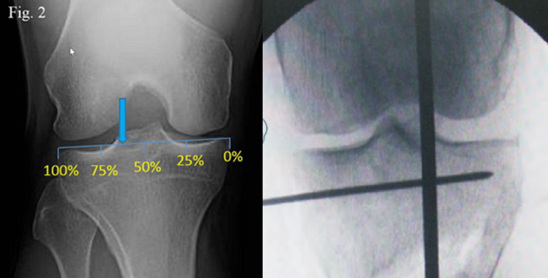 Coventry建议内翻畸形至少矫正至股骨胫骨解剖外翻角8°;Hernigou等发现患者术后机械外翻角在3°-6°时临床效果较好;Fujisawa等发现如果HTO术后力线通过胫骨外侧平台的30%-40%,软骨破坏则不再进展,若通过胫骨平台外侧的62%,则为最佳点,此点被定义为Fujisawa点。