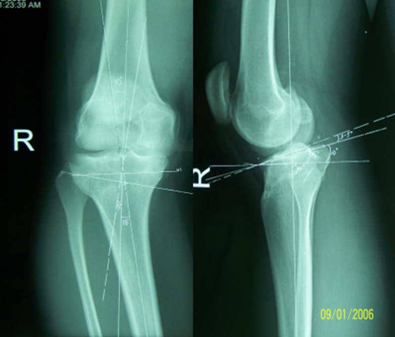 术前X线可见右膝关节内翻畸形约15°,胫骨平台前倾畸形13°