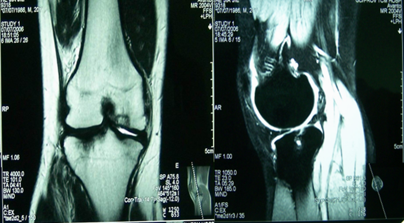 术前膝关节MR示:右膝内侧胫、股骨骨软骨面已有缺损并囊性变