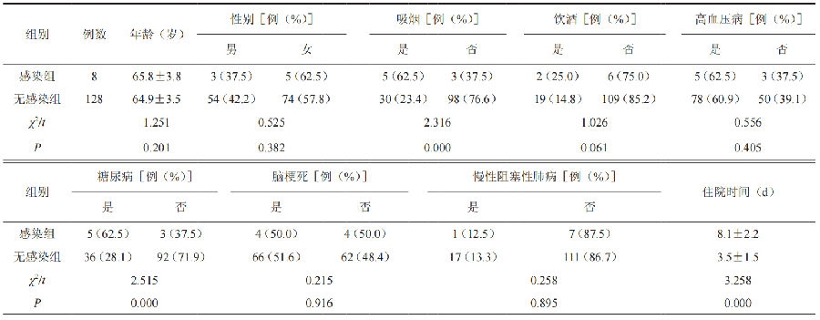 对可能影响术后发生感染的危险因素(性别、年龄、吸烟、饮酒、高血压、糖尿病、脑梗死、慢性阻塞性肺病、住院时间)进行统计。