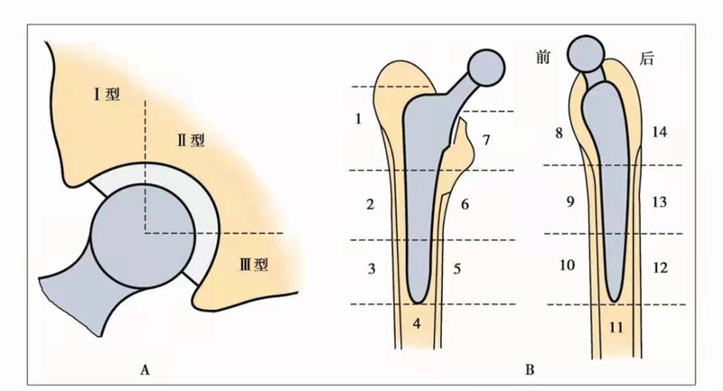 图1 人工全髋关节置换术后的影像学评价Engh改良的Gruen分区 A.髋臼侧Delee分区 B.股骨侧Gruen分区