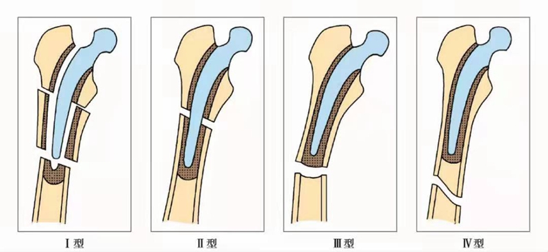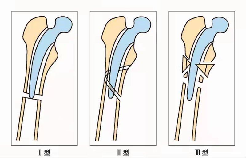 Ⅲ型:骨折线完全位于假体柄末端远端。