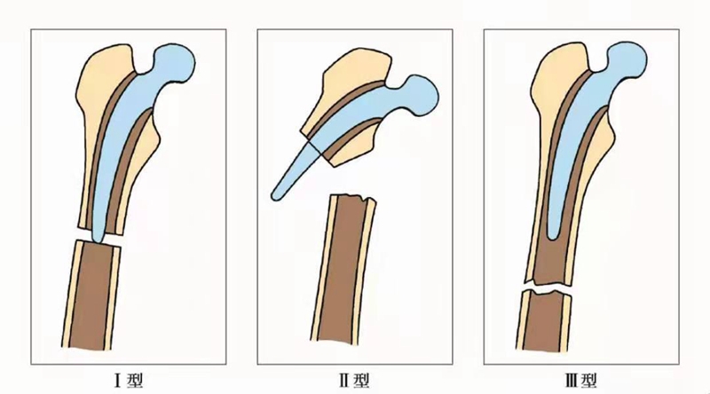 Ⅰ型:骨折线接近假体末端,假体柄仍然在髓腔内。