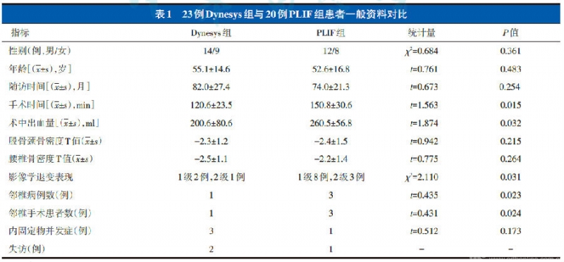 43例中接受Dynesys动态稳定系统者23例(Dynesys组);选取同期进行的双节段因腰椎管狭窄行腰椎融合术患者20例(PLIF组)。