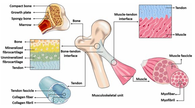 “骨骼-肌腱-肌肉”为整体的单元化再生医学示意图(doi:10.1016/j.biomaterials.2021.120789)