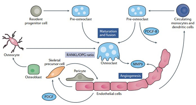 血管是一个多功能的运输网络系统,其在组织氧合、代谢和免疫监视等过程中发挥关键作用。血管系统还可以提供局部的分子信号,特别针对靶器官的特异性的分子信号。因此,血管化在发育、内环境稳态和组织再生方面具有重要作用。此外,在疾病的发生发展过程中,血管化也可以控制病灶周围其他类型细胞的生物学行为。在骨骼系统中,局部的血管系统参与了骨形成和骨吸收。此外,血管化还参与炎症过程,并可以影响关节疾病的发生与发展,如类风湿关节炎和骨关节炎等。研究者已经认识到骨骼系统中的血管系统远不是被动的导管系统。血管化是主动且动态性的生物学过程,其可以动态调节并参与局部微环境中其他细胞或分子的功能和调控。之前,骨质疏松的研究一直关注骨细胞和破骨细胞之间的平衡,也成为抗骨质疏松治疗的主要策略。然而,研究者发现抗骨质疏松治疗并未改善骨质量。因此,骨的血管化调控可能是平衡骨转换的重要因素之一,未来可以为骨质疏松症或OA领域的研究提供新思路。