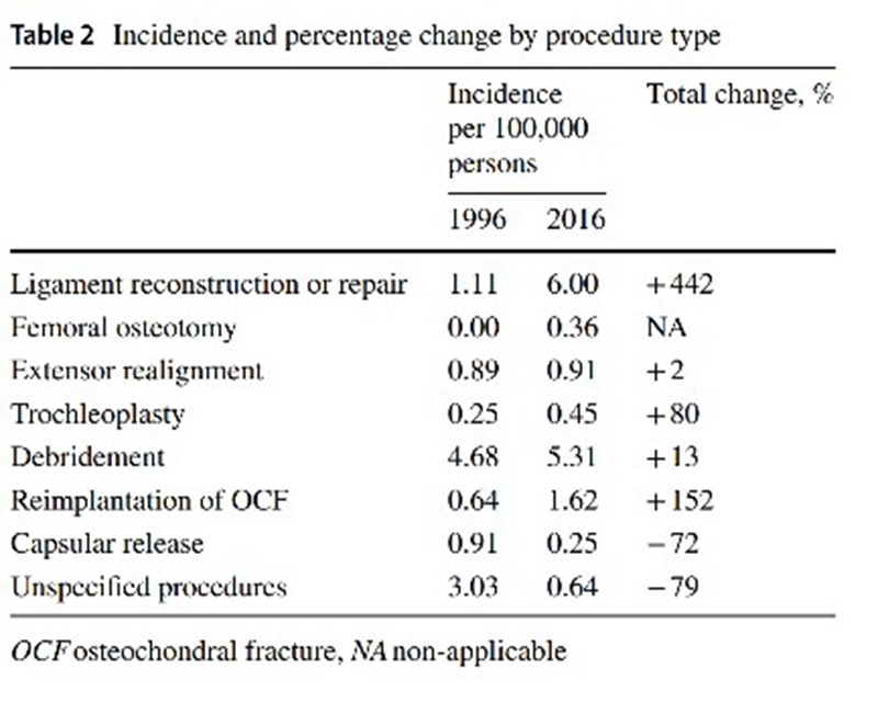 Mikko等人分析芬兰国家医院出院登记(NHDR)的数据,指出1997-2016年髌骨脱位手术的发生率保持不变,其中韧带重建术式逐渐流行。髌骨脱位的手术技术已经转向为重建受损的结构、改变先天性解剖危险因素[11]。目前治疗髌骨脱位与不稳越来越倾向于个性化治疗。