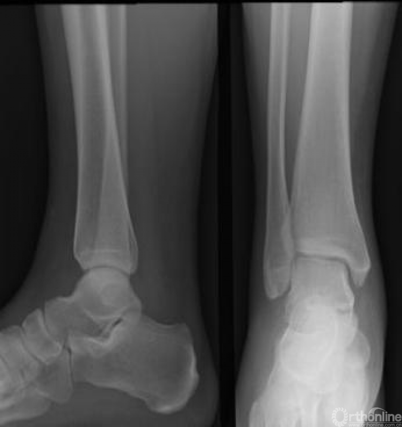 A型:外踝骨折线在踝关节和下胫腓联合以下,下胫腓联合韧带和三角韧带未损伤。如附有内踝骨折,骨折线几乎呈垂直,是由于距骨内翻力所致。