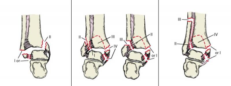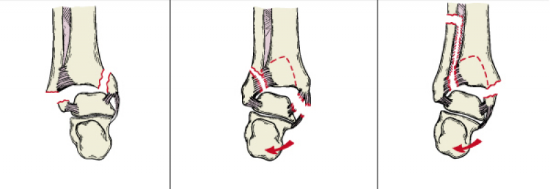B型:外踝在下胫腓联合平面骨折,多伴有内踝骨折或三角韧带损伤,由距骨的外旋力所致。