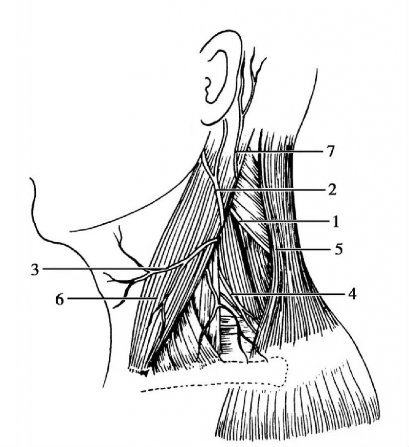 1.副神经;2.耳大神经;3.颈前皮神经;4.臂丛神经;5.斜方肌;6.胸锁乳突肌;7.枕小神经