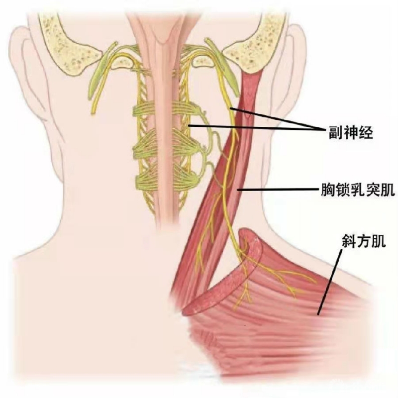 副神经由颈静脉孔穿出颅腔后,分为内外两支。内支为延髓根的纤维,加入迷走神经。外支是脊髓根的纤维,经过颈内静脉的前侧及二腹肌后腹的后面,在胸锁乳突肌中上1/3交界处穿入,再从此肌后缘中点穿出,进入颈后三角区。