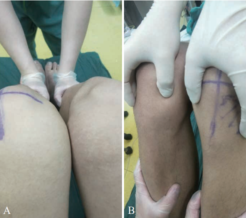 A.可明确看到正常侧(右膝)胫骨相对于股骨的前移明显超过PCL损伤侧(左膝);B.拇指沿正常侧(右膝)股骨内侧髁下滑被胫骨阻挡,PCL损伤侧(左膝)胫骨无法阻挡拇指下滑
