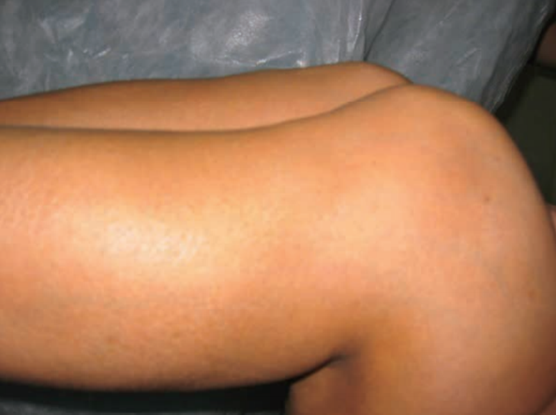 在后群肌用力时加强了胫骨后移,使胫骨结节塌陷效果更加明显