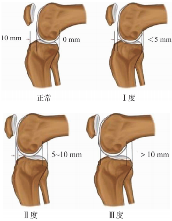 Ⅰ度:极少韧带纤维断裂,伴有局部疼痛,无不稳定,胫骨向后移位<5mm。Ⅱ度:较多韧带纤维撕裂,伴有一定的功能丧失和关节反应,胫骨向后移位在5~10mm之间。