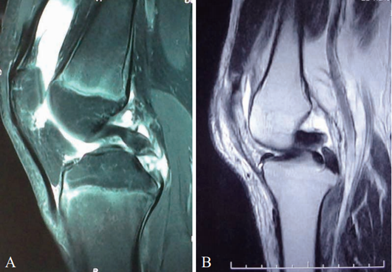 A. 12岁患者脂肪抑制像显示PCL从邻近胫骨止点部位断裂;B. T2像显示PCL从纤维中部断裂