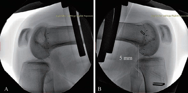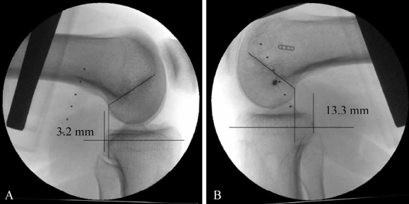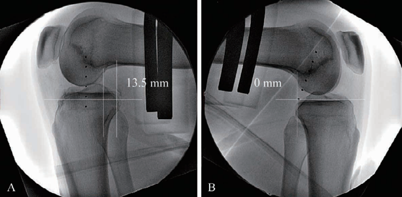 应力位X线片示患侧(B)胫骨后移超过健侧(A)13.5mm