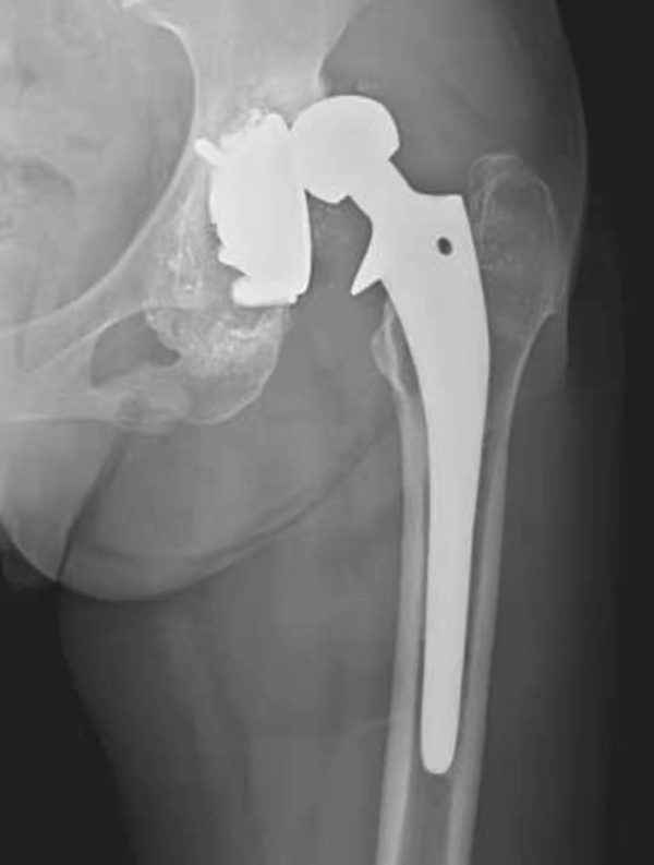 平片,示右侧股骨上段骨质疏松,人工股骨柄周围明显骨质吸收,透亮带明显增宽,髋臼杯位置未见改变