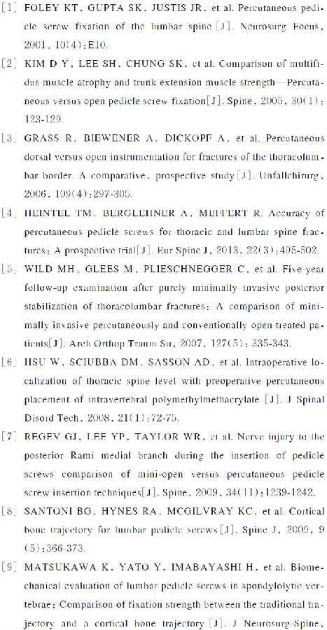 经皮椎弓根螺钉技术(percutaneous pedicle-screw fixation, PPSF)在2001年由FOLEY[1]最先提出并报道了基于Sextant系统的椎弓根螺钉技术,该方法理论上避免了对椎旁肌肉的广泛剥离和侧向的持续牵拉,故不易损伤肌肉和相应脊神经后支的内侧支和外侧支。