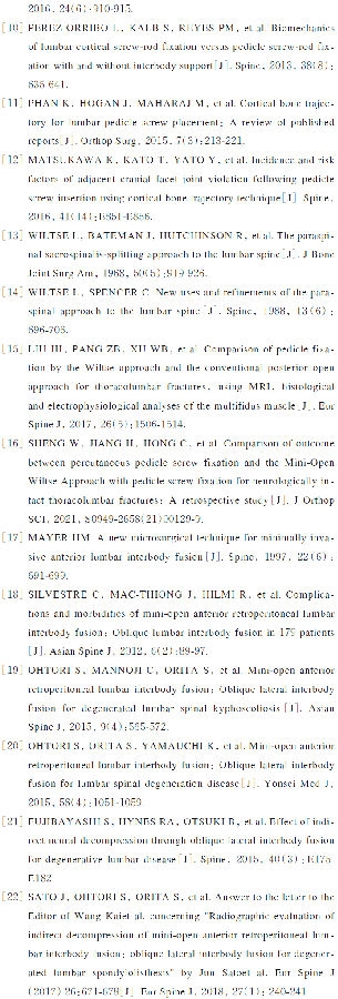 为了最大限度地减少医源性软组织损伤,2003年由FOLEY等[27]在开放经椎间孔腰椎椎体间融合术(transforaminal lumber interbody fusion,TLIF)的基础上首次引入MIS-TLIF。此后的大量研究表明,与传统的开放式TLIF相比,MIS-TLIF具有同等或更好的临床效果[28-31]。