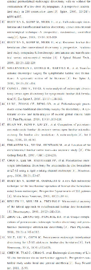 TELD可以治疗各种类型的腰椎间盘突出症,且疗效也在大量随机对照试验和荟萃分析中被证实[36,38-45]。在动力系统帮助下,TELD也能完成高效的韧带和骨性结构减压,已经可以进行椎管狭窄的微创治疗。