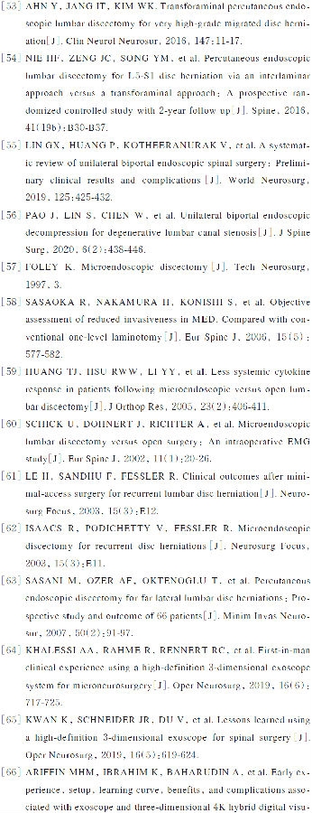 虽然MED适用于多种类型的腰椎间盘突出症[61-63],但需要具有20~30例经验才能得心应手,所以早期的并发症相对较高。但经过系统学习和实践克服学习曲线后,该技术是一种可以取代传统开放手术的优秀技术。