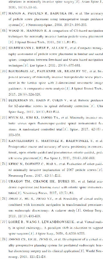 技术的不断进步是微创腰椎外科的生命和未来,脊柱医生需要将新的科技进步整合到微创技术中,例如:3D显微镜提供了出色的沉浸式光学体验系统和良好的深度感知优势[64-66],可以更好地观察术中三维解剖结构,使手术变得更容易和精确;术中导航系统可以提高椎弓根螺钉的放置精度[67-70],还可以将内镜工作套管插入轨迹可视化,从而精确规划切口位置、定位手术节段,减少手术时间,降低初期进行内镜手术的难度;机器人技术有助于脊柱外科医生进行术前计划、改善术中操作和学习曲线,最终帮助医生以安全、高效和可预测的方式进行MIS手术,最终提高术后疗效和患者满意度[71-75];而虚拟现实、增强现实和混合现实技术可以帮助术者确定手术部位、提高手术效率和精度[76-78]。