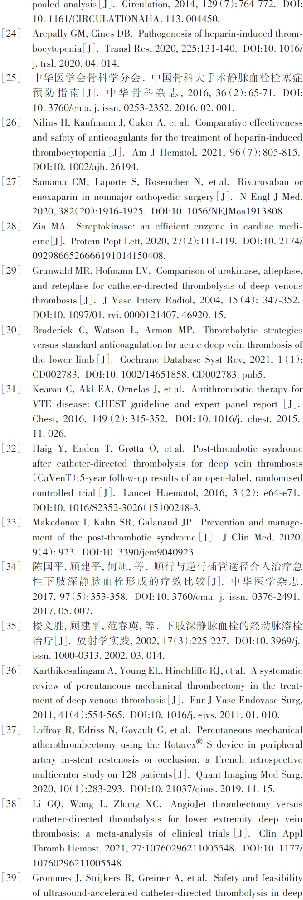 目前出现了将PMT和CDT两者结合以去除血栓的治疗方法,即PCDT,其在降低PTS风险方面显示出较为满意的结果[42]。与单独的CDT相比,PCDT的潜在益处包括手术时间更短、溶栓剂量更低、全身影响更小、成本更低、血栓消退更彻底[43]。但其临床效果还有待进一步研究论证。