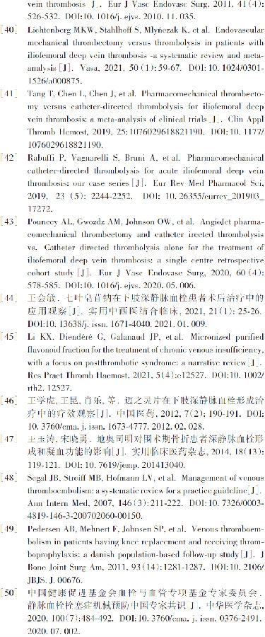 临床研究表明,在下肢急性DVT的治疗中迈之灵能安全有效地促进肢体肿胀的消退[46],地奥司明在围术期的应用能有效预防骨科手术DVT[47],可见其对DVT患者均有一定的疗效。