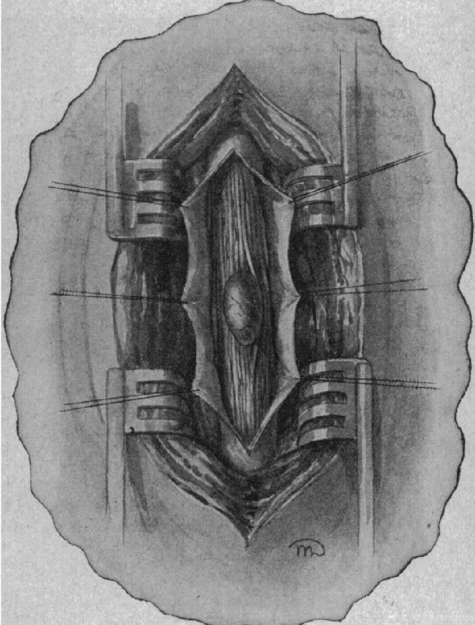 (2)椎间盘突出致病学说从根本上改变了手术的创伤和理念,肿瘤性病变需要更加充分的显露和椎板切除,而突出椎间盘切除所需的显露和椎板切除量要远小于肿瘤,客观上促使更加“微创”的手术方式的提出,如JG love在1939年提出的椎板间入路突出椎间盘摘除术,我们习惯称为“腰椎小开窗手术”。