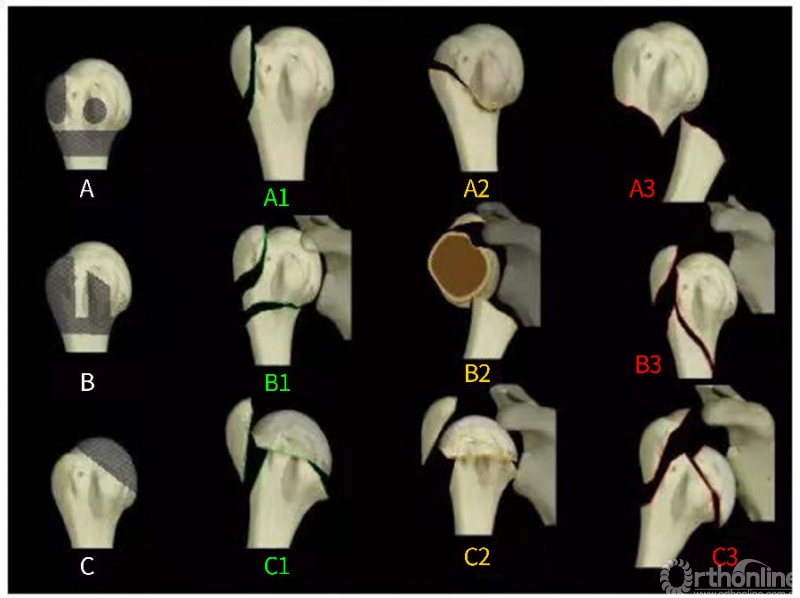 A型:关节外单处骨折;B型:关节外两处骨折;C型:关节内骨折,该分型提示了肱骨头坏死的危险性。