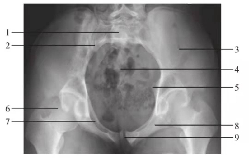 1.髂骨翼;2.骶髂关节;3.骶骨;4.耻骨上支;5.耻骨联合;6.股骨颈;7.坐骨支;8.尾骨;9.耻骨下支