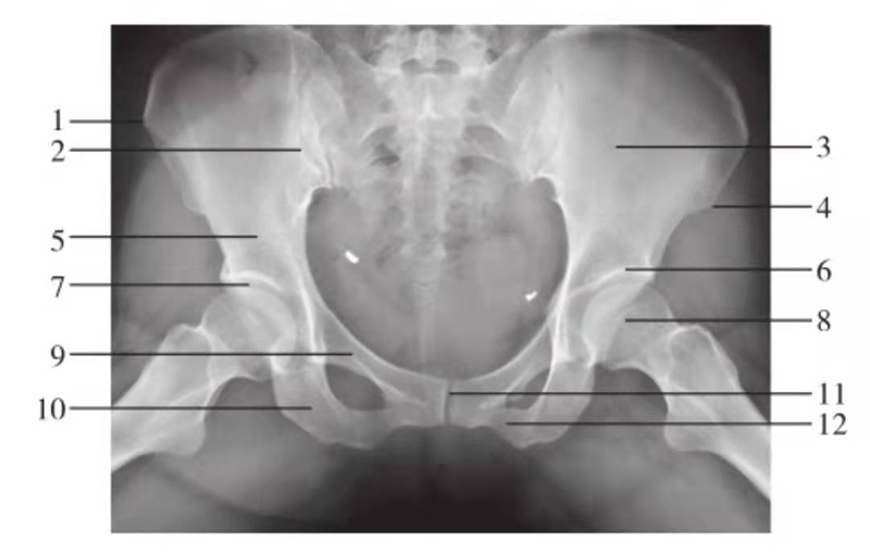 1.髂前上棘;2.骶髂关节;3.髂骨翼;4.髂前下棘;5.髂骨体;6.髋臼;7.关节间隙;8.股骨头;9.耻骨上支;10.坐骨支;11.耻骨联合;12.耻骨下支