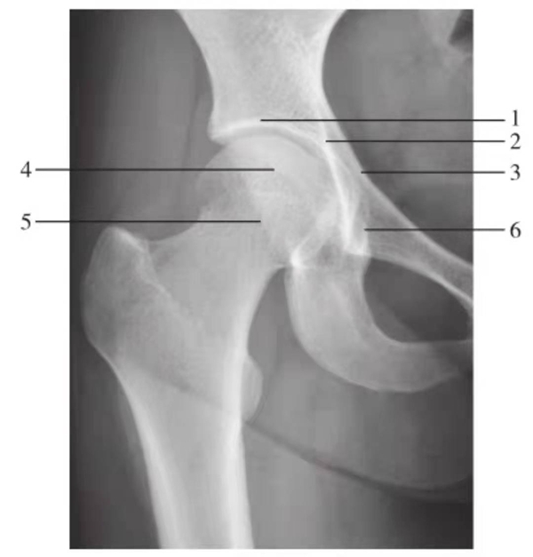 1.髋臼线;2.髂坐线;3.髂耻线;4.前唇线;5.后唇线;6.泪滴