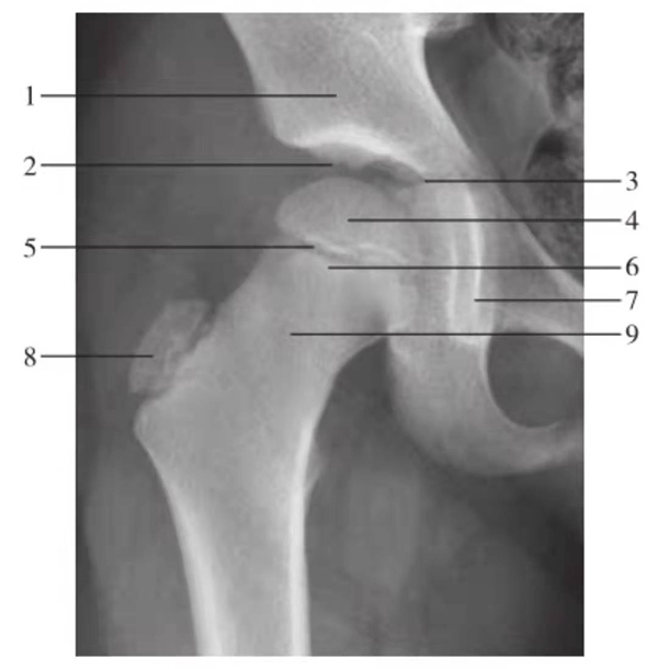 1.髂骨;2.髋关节间隙;3.Y形软骨;4.股骨头骨骺;5.骨骺板;6.临时钙化带;7.泪滴;8.大转子骨骺;9.股骨颈