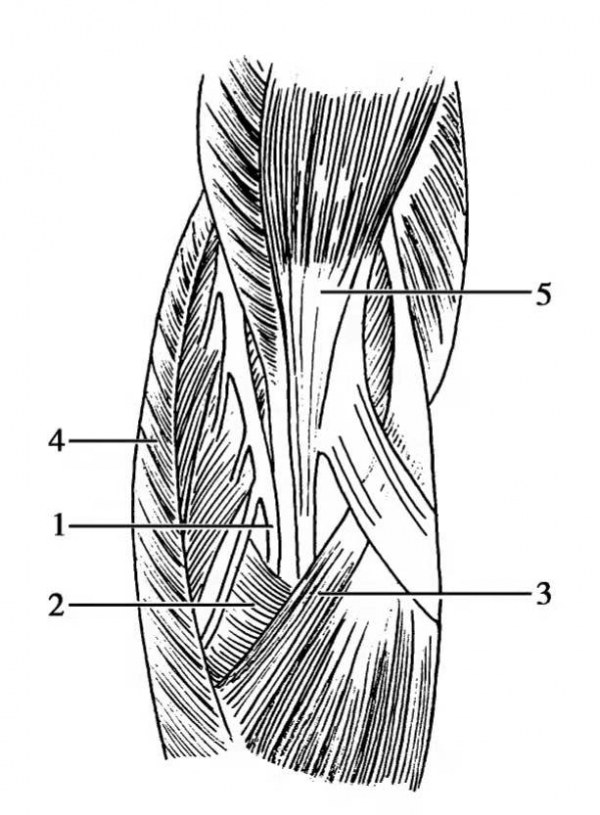 图3 旋后肌Frohse弓与桡神经深支的关系 1.桡神经深支;2.Frohse弓(旋后肌);3.旋前圆肌;4.肱桡肌;5.肱二头肌